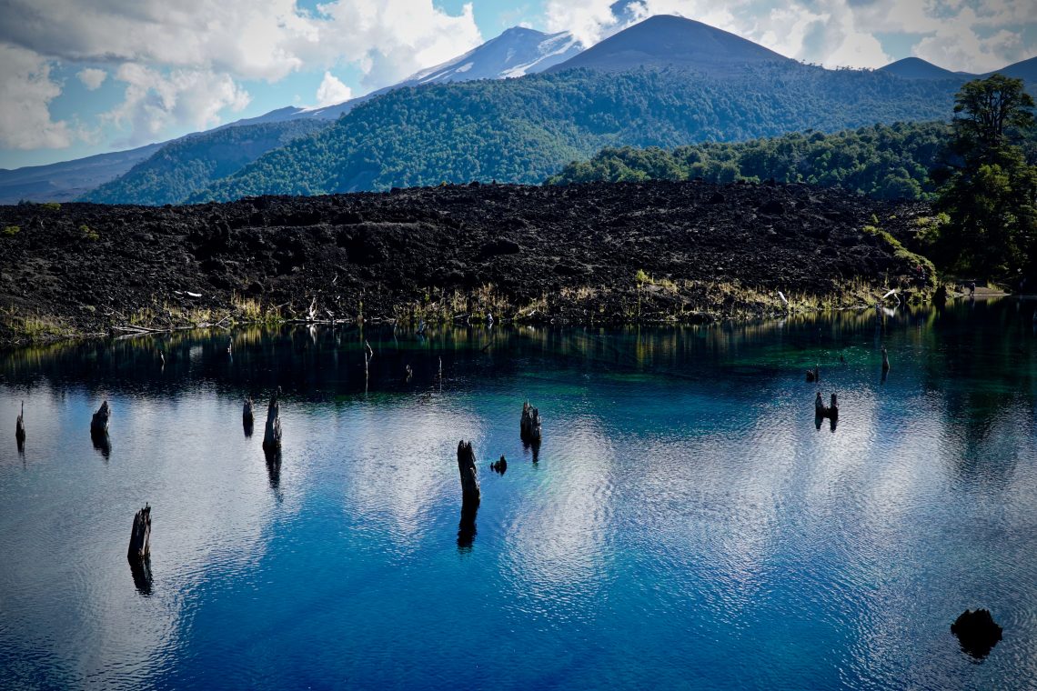 Wir fahren weiter zur Laguna Arco Iris (=„Regenbogen“), die erst 1994 durch den Ausbruch des Llaima von einen Lavafluss aufgestaut wurde. Der See ist glasklar und schimmert in allen möglichen Farbfacetten und stellenweise ragen noch Baumstämme aus dem Wasser. Angeblich wurden/werden hier gerne Dinosaurier-(Dokumentar)-Filme gedreht…was ich mir wirklich gut vorstellen kann.
